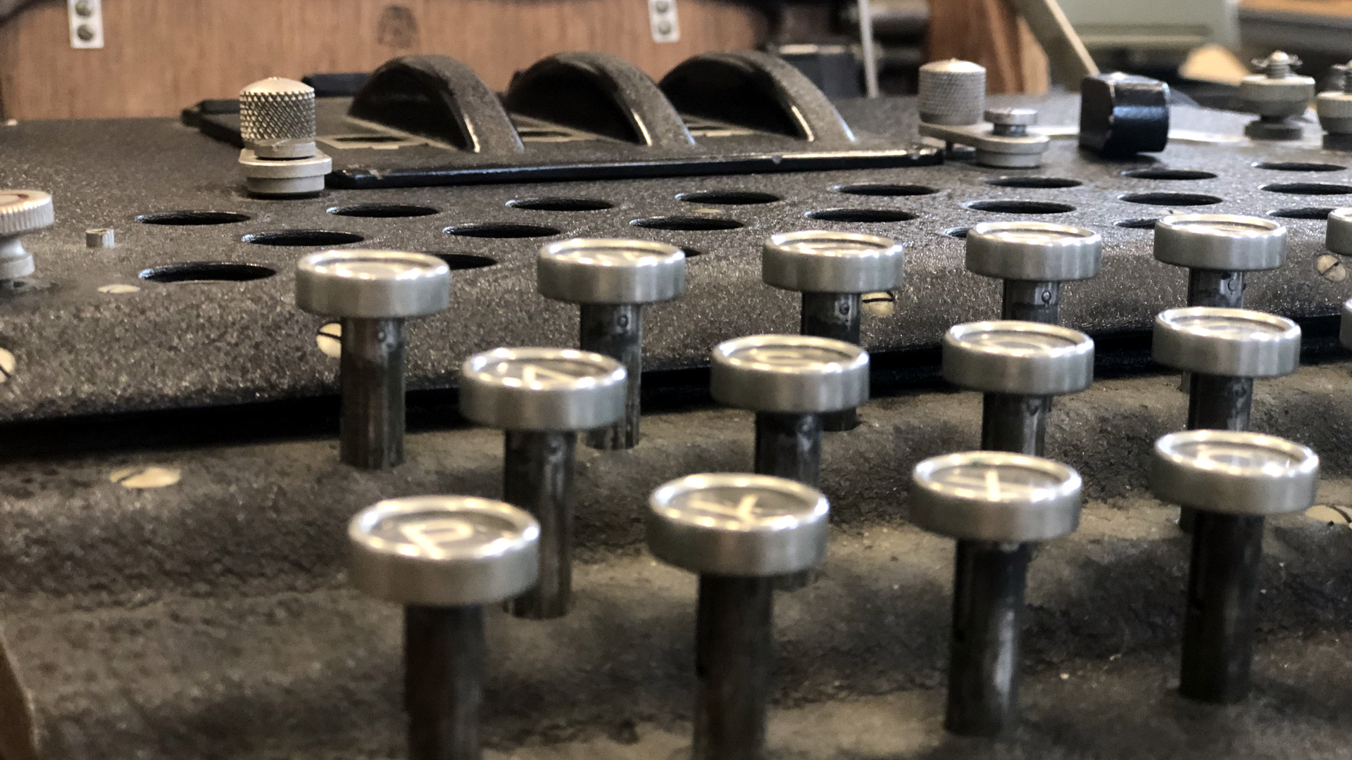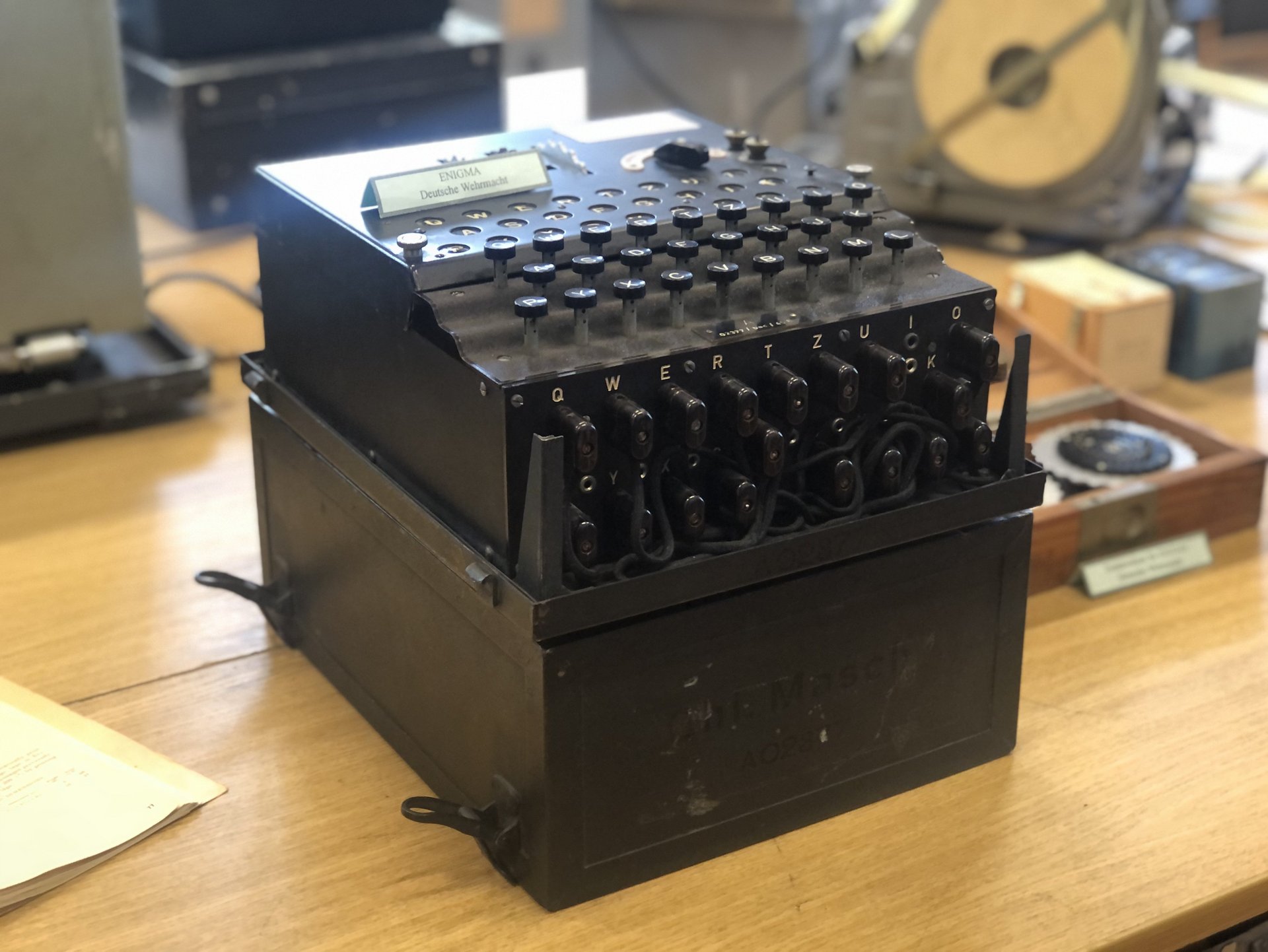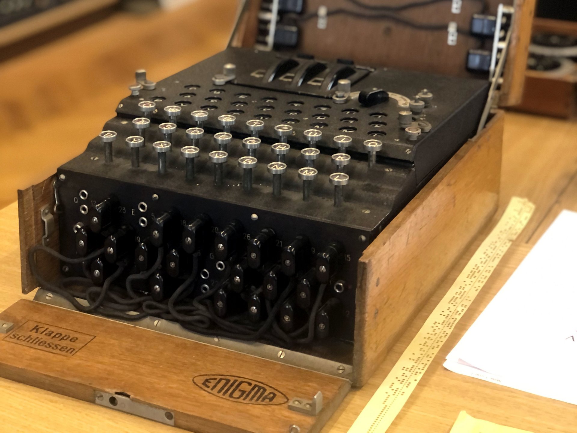 Die "Enigma“ ist eine Rotor-Schlüsselmaschine, die im Zweiten Weltkrieg zur Verschlüsselung des Nachrichtenverkehrs der Wehrmacht verwendet wurde.