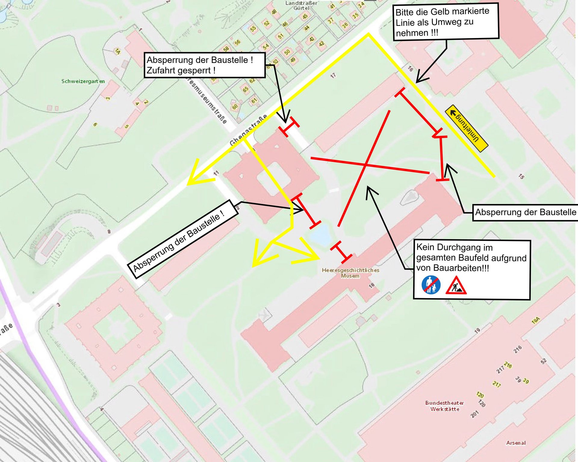 Zur Zeit sind die Arbeiten zur Sanierung des Vorplatzes des Heeresgeschichtlichen Museums in vollem Gang. Es stehen daher im Moment keine Parkplätze vor dem Museum zur Verfügung. Bitte nutzen Sie wenn möglich die öffentlichen Verkehrsmittel für Ihre Anreise.