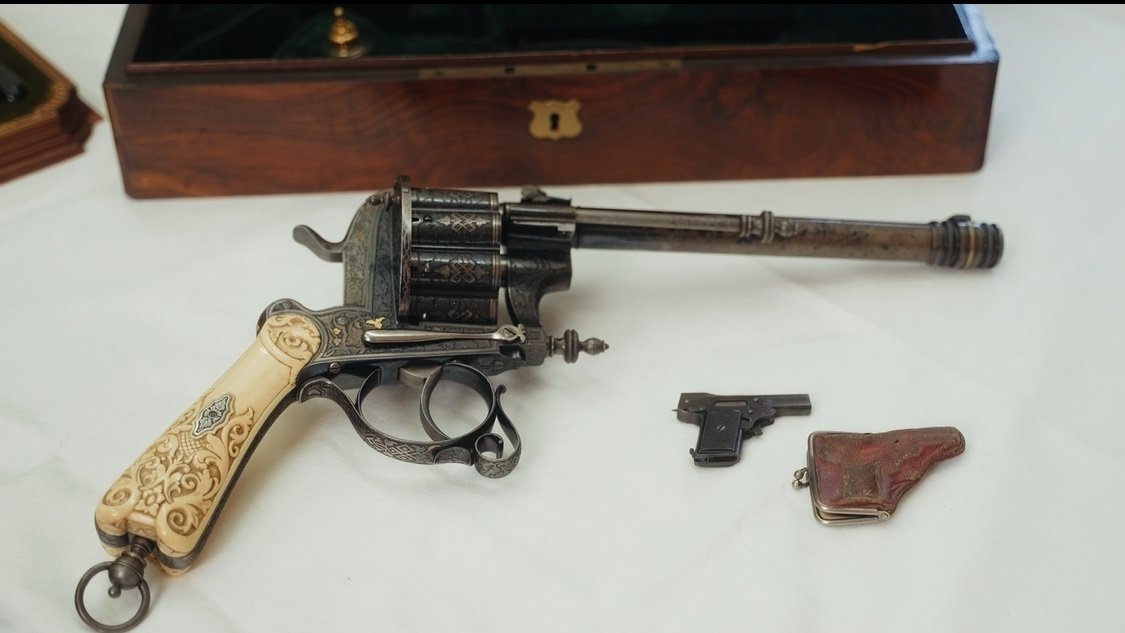 Zwei Waffen, wie sie unterschiedlicher kaum sein könnten – eine winzige Taschenpistole und ein eindrucksvolles Jubiläumsmodell.