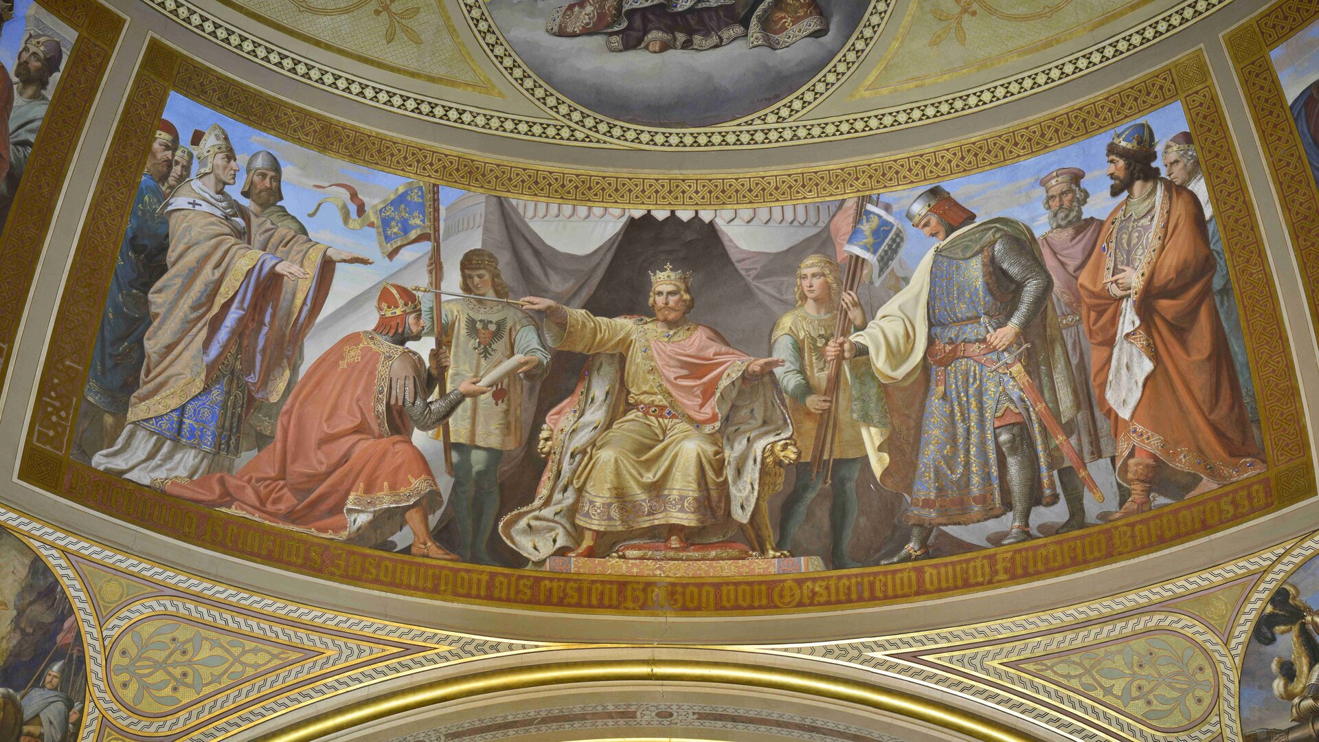 Wer die Ruhmeshalle betritt, begegnet nicht nur dramatischen Schlachtenszenen, sondern auch politischen Wendepunkten der Geschichte. Eine zentrale Darstellung des Babenberger-Zyklus zeigt, wie Kaiser Friedrich I. Barbarossa im Jahr 1156 den Babenberger Heinrich II. Jasomirgott mit dem zum Herzogtum erhobenen Österreich belehnt – und zugleich Heinrich dem Löwen Bayern überträgt.