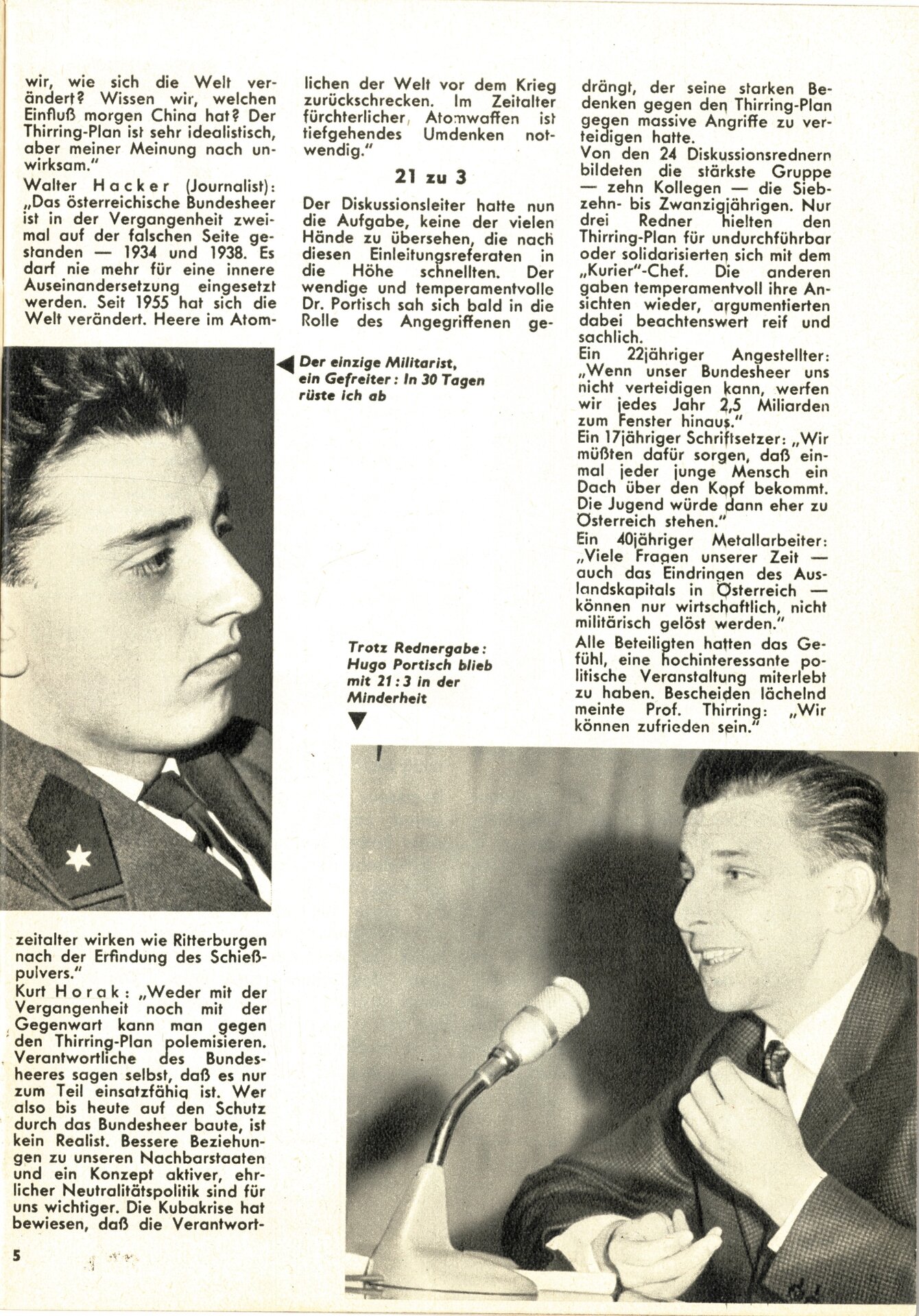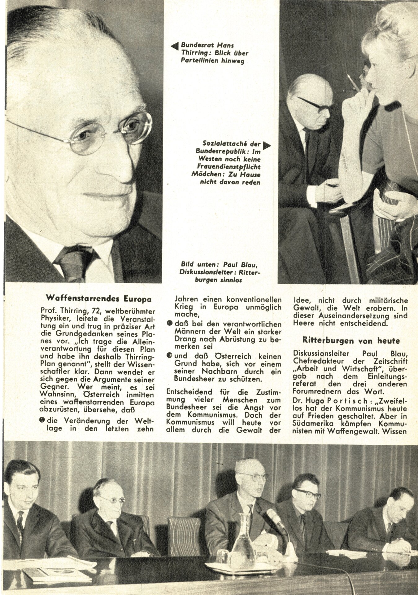 Hans Thirring (1888-1976) war Professor für Theoretische Physik an der Universität Wien. Von den Nationalsozialisten 1938 zwangsbeurlaubt, ob seiner Beschäftigung mit der „jüdischen” Relativitätstheorie sowie seiner pazifistischen und damit „wehrkraftzersetzenden" Haltung, erhielt er nach dem Krieg seine Professur zurück und war 1946/47 Dekan der Philosophischen Fakultät. 1957 war Hans Thirring Mitbegründer der ersten Pugwash-Friedenskonferenz, wo Themen wie Verantwortlichkeit von Wissenschaftern und die Gefahr der nuklearen Aufrüstung diskutiert wurden. Thirring war auch politisch in Österreich tätig, er wurde von 1957 bis 1964 für die SPÖ in den Bundesrat entsandt. Seine als Thirring-Plan bekannt gewordene Idee der einseitigen Abrüstung Österreichs löste im Dezember 1963 einen Tumult im Parlament aus (Quelle: Wikipedia). Die Zeitschrift hallo berichtetet damals über die Pressekonferenz: